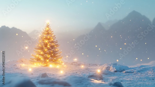 Christmas Tree With Baubles And Golden Lights In Snowy Landscape