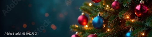 Christmas tree with colorful ornaments and lights, sparkle, holiday, decorations