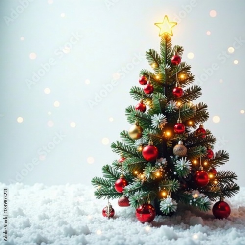 Christmas tree with festive ornaments and lights against a snowy white background , mistletoe, holiday cheer