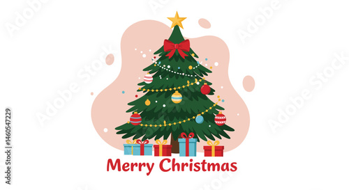 Christmas tree with gifts and decorations for festive holiday celebration in green red and gold colors