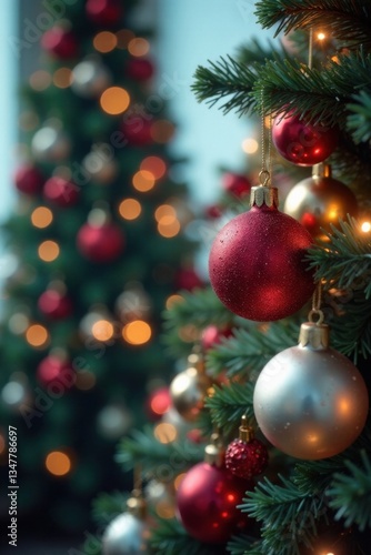 Christmas tree with glass ornaments in soft focus, baubles, festive decorations