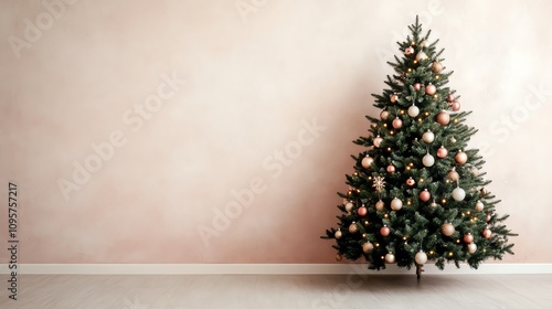 Christmas tree with ornaments against a soft pink wall, festive holiday atmosphere.
