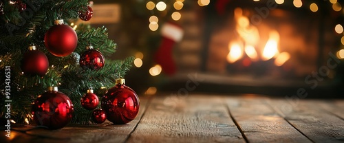 Christmas tree with red ornaments on wooden table, blurred fireplace background.