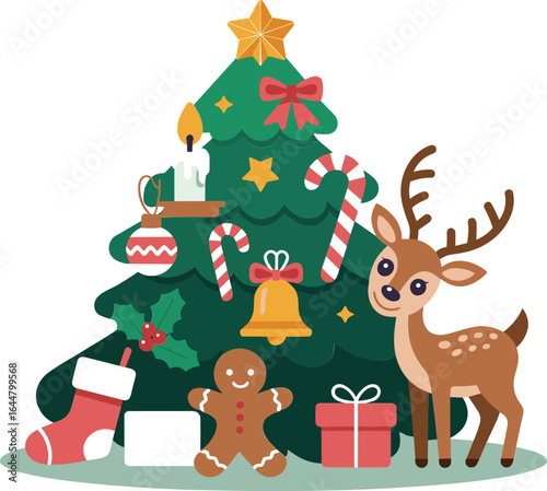 Christmas tree with reindeer gingerbread man and presents silhouette