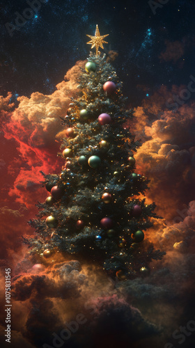 Christmas tree with star in cosmic clouds, festive holiday atmosphere