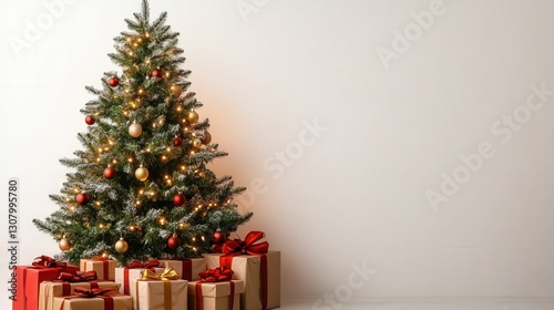 Christmas tree with twinkling lights and neatly wrapped gifts underneath, set against