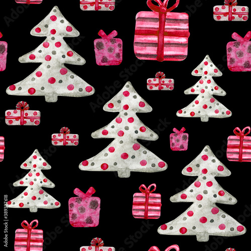 Christmas trees and gifts seamless pattern. Hand drawn watercolor clipart on black background with textured pattern for Merry Christmas design, invitations, congratulations, background, banner