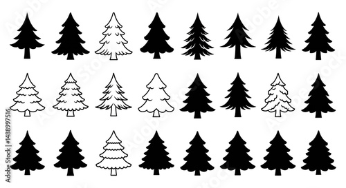 Christmas Trees Forest Line Art Black and White Winter Holiday Pine Tree Set Evergreen Silhouette