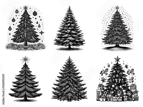 Christmas Trees with Gifts and Decorations Set collection bundle sketch engraving generative ai PNG illustration. Scratch board imitation. Black and white image.
