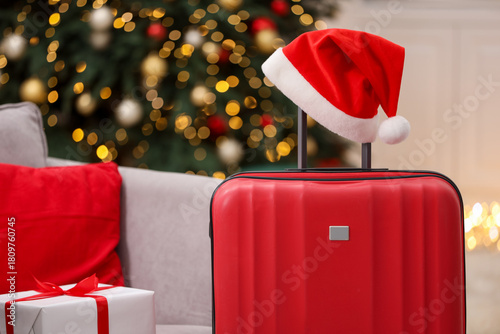 Christmas vacation. Suitcase with Santa hat and gift box indoors, closeup