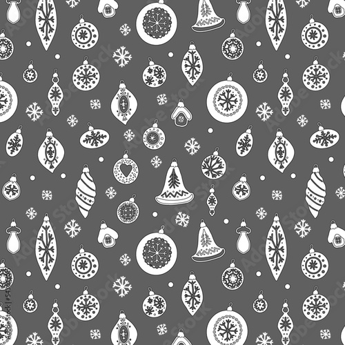 Christmas vector pattern. White and black elements on a gray background. A good addition to brighter backgrounds, texts, decor.