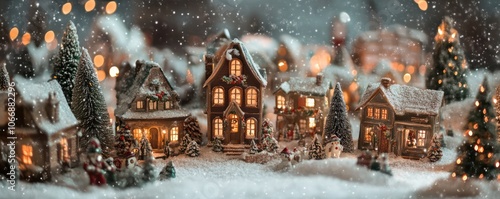Christmas village in vintage style, with a snowy landscape and festive holiday decorations.
