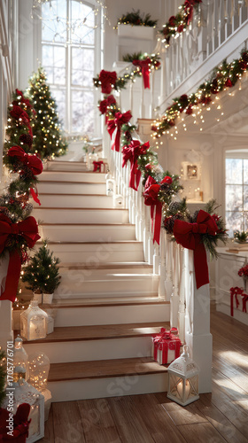 Christmas white staircase in bright home interior with garlands, red bows, pinecones, fairy lights, festive cozy atmosphere, daylight. , copy space,