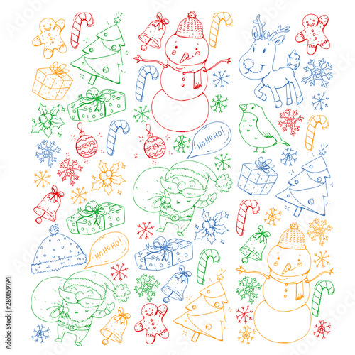 Christmas winter party. Happy new year. Bullfinch, Santa Claus, snowman, deer. Presents and candy.