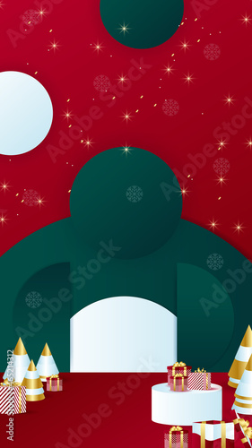 Christmas winter stories background with gift box, star, snow, and xmas tree. Trendy square Winter Holidays art templates. Design for social media post, mobile apps, banner design and web/internet ads