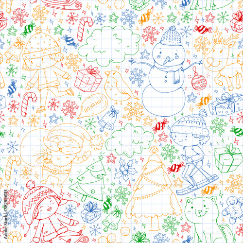 Christmas winter vector background with children. Kids vacation and sport.