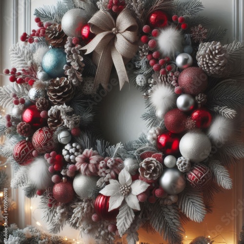 Christmas wreath with ornaments, berries and pinecones on a white door. Holiday decoration concept