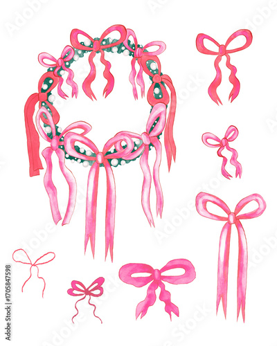 Christmas wreath with pink bows and a collection of bright pink bows. Watercolor-style illustration.
