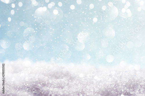 Chritmas light background with snow and blue sky.