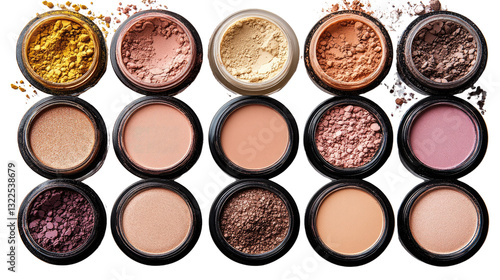 Chromatic Palette: A meticulously arranged collection of vibrant makeup jars, filled with an array of finely milled, eye-catching pigments, representing beauty, cosmetics, and style.