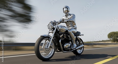 Chrome Motorbike Rider on Open Road | Futuristic Metallic Motorcycle in Motion for Automotive and Transportation Advertising