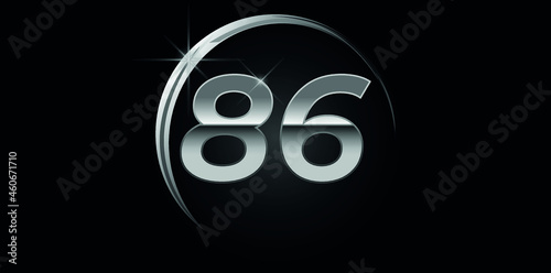 Chrome vector number 86. Logo for birthday, celebrations, dates with silver ring isolated on black background with silver light, vector design for celebration, invitation card and greeting card
