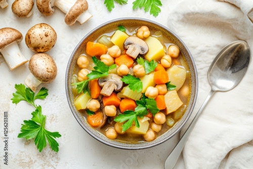 Chunky vegetable stew in a deep bowl with vibrant orange-brown sauce, served with a spoon and linen cloth