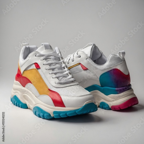 Chunky white sneakers with colorful soles, isolated on white.