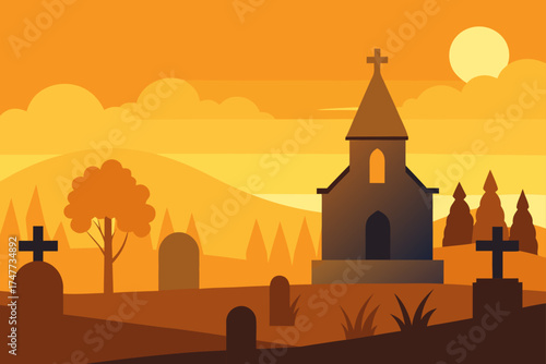 Church and graveyard scene with sunset background