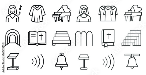 Church and worship outline icons set – religious, spiritual, faith symbols