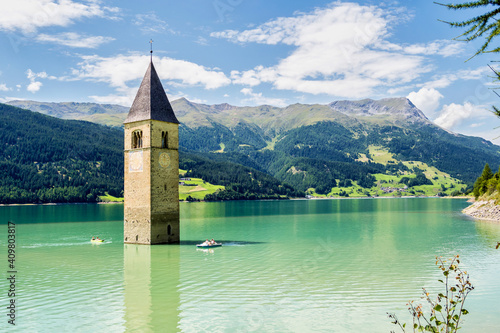 Church in the water at Lake Reschen in Tyrol in north Italy