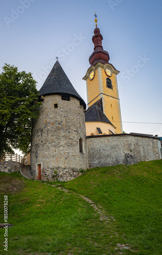 Church of Saints Peter and Paul on hill in Tarvisio, northeast Italy, with defensive walls and clock tower