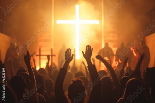 Church worship concept. Christians with raised hands pray and worship to the cross in church building