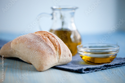 Ciabatta bread with herbs and olive oil on wooden background ready to eat snack Mediterranean style