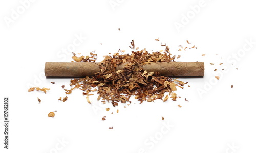 Cigarillos and tobacco pile isolated over white background