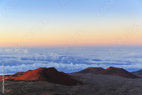 Cinder cones and caldera from ancient lava eruptions atop 4200 meter Mauna Kea, tallest mountain in Hawaii, at sunset; Island of Hawaii, Hawaii, United States of America