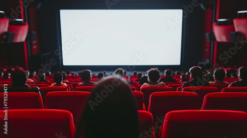 Cinema blank screen and people in red chairs in the cinema hall. Blurred People silhouettes watching movie performance. Made with generative ai