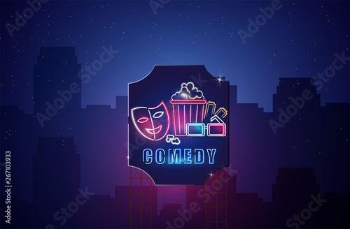 Cinema neon symbols Vector. Glowing sign dark background. Shinning billboard templates
