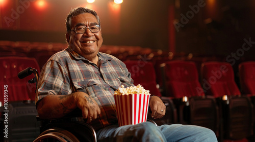 Cinema watching film accessibility for people with disabilities. Senior man in wheelchair with popcorn in hands smiling while watching movie