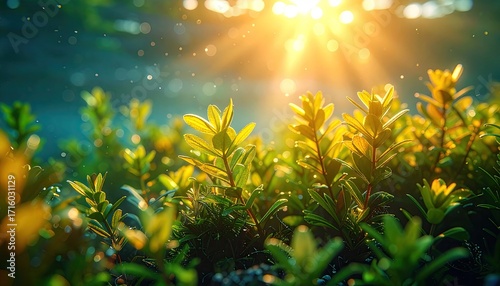 Cinematic HDR Photography of Green Plant with Sunlight Bursting Through Ultra Sharp Details and Glowing Neon Elements in a Dreamy Serene Landscape