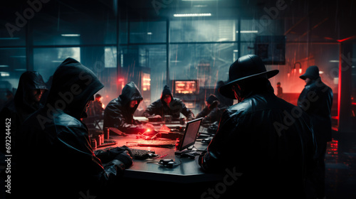 Cinematic intense moment of masked bank robbers storming into the vault, bags in hand. Robbers, money, jewelry. The robbers are planning a robbery. Generative ai