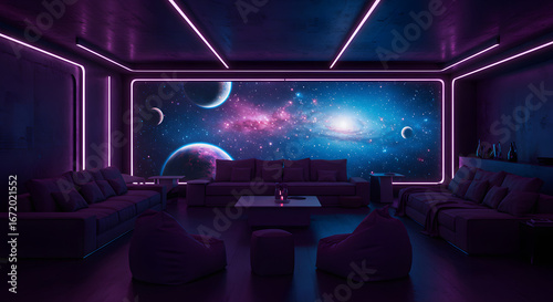 Cinematic Interior of Modern Lounge with Plush Seating and Cosmic Wall Art