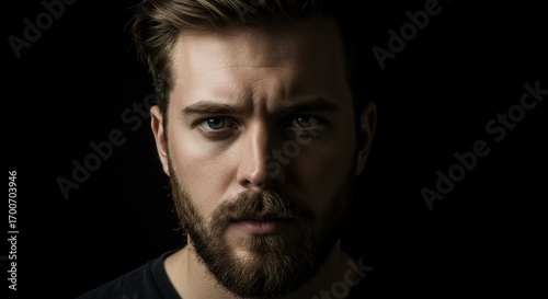 Cinematic Man Portrait: Stylish Beard, Intense Gaze, Dramatically Lit with High Contrast Lighting, Character Focus.