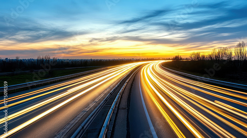 Cinematic motion of car lights forming trails on highway at sunset creates stunning visual