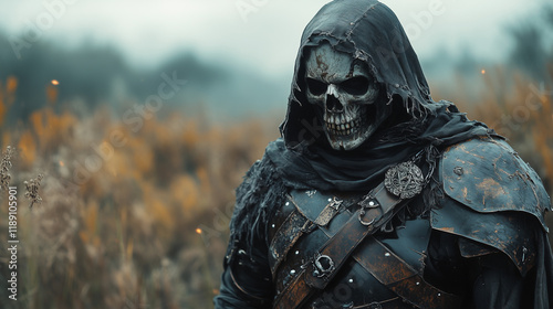 Cinematic shot, full-body photo of a skeleton warrior wearing leather armor, epic scene