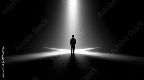 Cinematic silhouette of lone figure standing beneath bright beam of light
