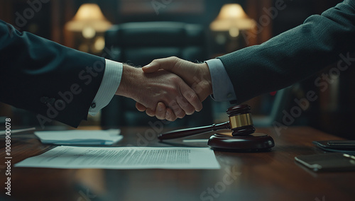 Cinematic stock photo of an outside law office, with a lawyer shaking hands with their client over a table