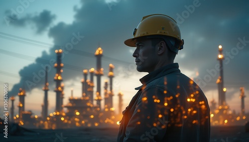 Cinematic view of a solitary oil worker at dusk with refinery in background highlighting industrial challenges