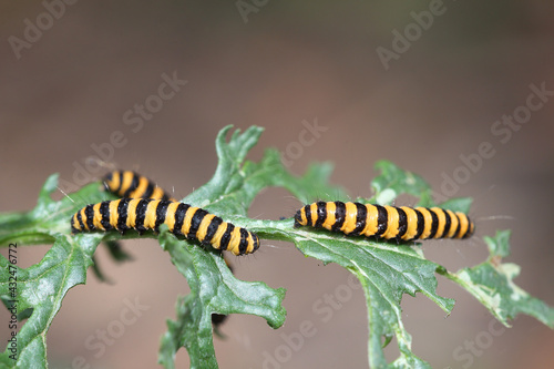 Cinnabar moth caterpillars (Tyria jacobaeae) on their foodplant, Common Ragwort, (Senecio jacobaea), UK.