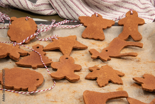 Cinnamon dough. Parchment paper covered baking sheet with cinnamon dough ornament shape cut outs. Star, Santa, Angel, snowflake, gingerbread person.
